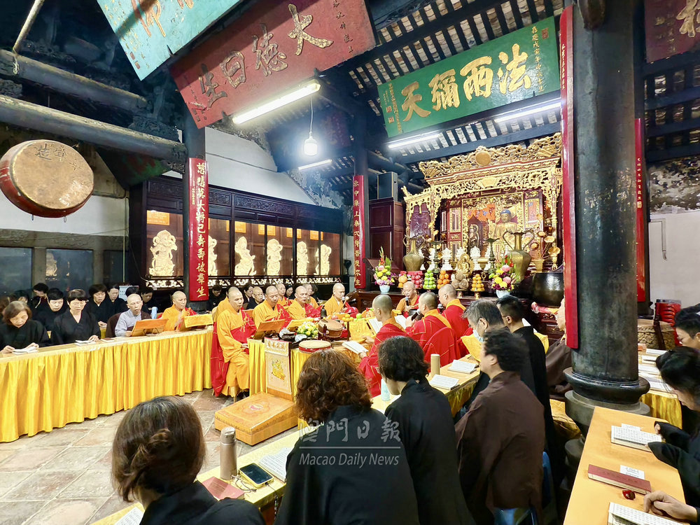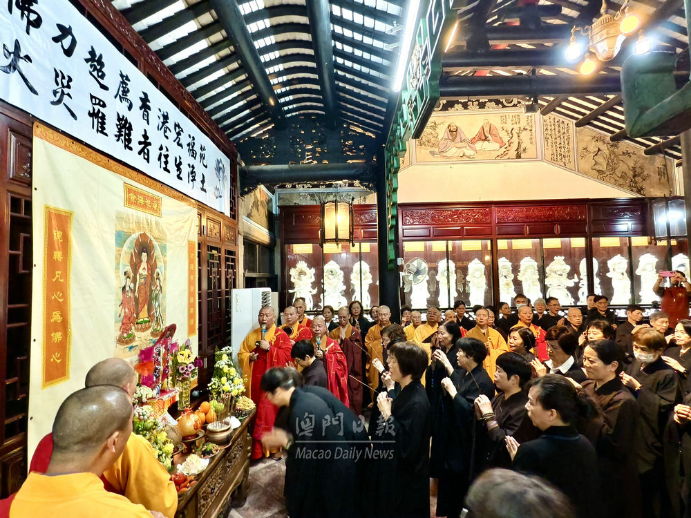 【澳門日報消息】為深切哀悼香港近期重大火災事故中的遇難者,並祈願傷者早日康復,澳門佛教總會今日傍晚六時在普濟禪院(觀音堂)舉行“頭七追薦法會”,歷時三小時,現場肅穆殊勝,僧眾齊聚,十方善信同心參與,共同匯聚慈悲善念,迴向受災同胞。